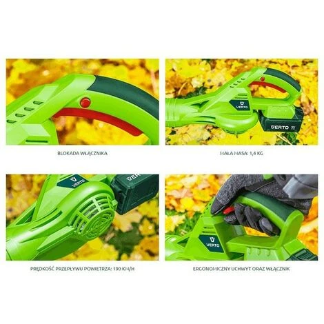Le souffleur à batterie VERTO est un appareil de soufflage pratique et fonctionnel. Il peut être utilisé aussi bien à la maison, dans le jardin que dans un atelier ou un garage. Il permet le nettoyage antistatique, le dépoussiérage et le séchage des machines et appareils, ainsi que le soufflage des feuilles, de l’herbe, des aiguilles des terrasses, allées et trottoirs. Il est doté d’une poignée ergonomique pour un travail confortable d’une seule main. La conformité aux normes de sécurité européennes est assurée par le certificat CE.