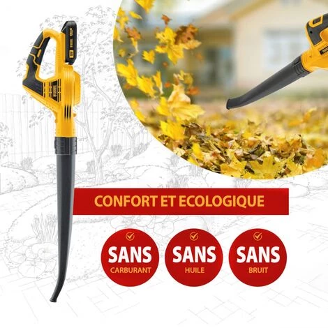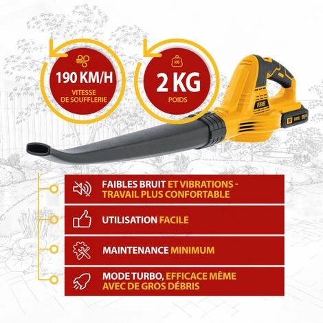 Le souffleur sans fil RB190-18 DENZEL est conçu pour le nettoyage et l’entretien du jardin.Sa batterie permet de passer dans tout le jardin sans s’emcombrer d’un fil, et de manière plus silencieuse qu’un souffleur thermique.Il permet un soufflage efficace, en effet il dispose d’une buse grande vitesse permettant au flux d’air d’atteindre une vitesse de 190 km/h.Sa légèreté et sa poignée souple, ergonomique, et antidérapante assureront un confort d’utilisation hors norme.Rangement facile. Batterie Li-Ion rechargeable et chargeur inclus.Informations techniques :- Batterie : Li-Ion, 18V, 2Ah- Temps de charge : 4h- Débit max. : 60 m3/h- Poids : 2kg