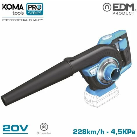 ASPIRATEUR SOUFFLEUR 20V (SANS BATTERIE ET CHARGEUR) 97x93cm KOMA TOOLS PRO SERIES BATTERYASPIRATEUR SOUFFLEUR. PUISSANCE : 20V. LI-ION (SANS BATTERIE ET CHARGEUR). SAC INCLUS. NE CONVIENT PAS AUX FEUILLES DE JARDIN. LUMIÈRE LED POUR ÉCLAIRER LE POINT DE TRAVAIL, COMMUTATEUR ROTATIF POSITION SOUFFLEUR/ASPIRATEUR. POIGNÉE ERGONOMIQUE SOFT TOUCH. DÉBIT D’AIR 228Km/h. ASPIRATION 4.5KPa. AVEC INTERRUPTEUR DE SÉCURITÉ. BUSE AMOVIBLE INCLUSE. POSITION SOUS VIDE: PLACEZ LA POIGNÉE EN POSITION SOUS VIDE. INSÉRER LA BUSE DANS LA PRISE D’ASPIRATION ET CONNECTER LE SAC DE RÉCUPÉRATION DANS LA PRISE DE SORTIE D’AIR. UTILISER LES PILES REF:08770 (15min) 08774 (30min. DIMENSIONS: 97x93cm (profondeur/hauteur) KOMA TOOLS PRO SERIES BATTERY