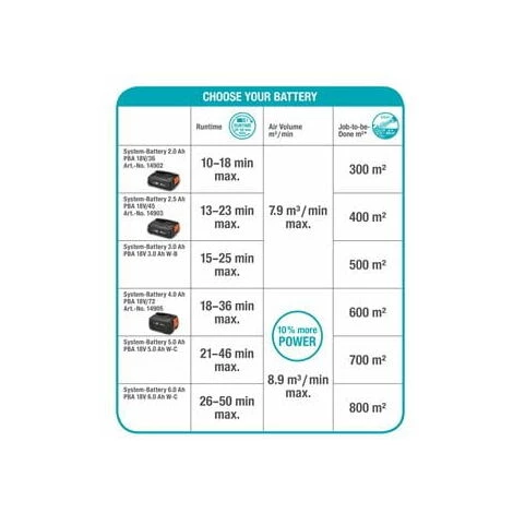 Le soufflleur sur batterie est livré sans batterie et chargeur. Il est compatible avec toutes les batteries et chargeurs 18 V de l’ALLIANCE POWER FOR ALL. Vous pouvez ainsi choisir la batterie et le chargeur les mieux adaptés à vos besoins. En fonction de la batterie sélectionnée, le souffleur offre une autonomie comprise entre 26 et 50 minutes.