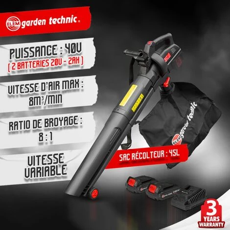 Cet aspirateur-souffleur offre un ratio de broyage de 8:1, un ratio idéal pour enrichir son compost de feuilles finement broyées. Il est équipé d’un sac récolteur d’une capacité de 45 L. Pour vous faciliter son transport, cet aspirateur-souffleur est équipé de roues ainsi que d’une sangle.