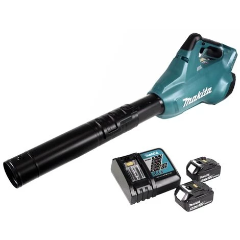 Avec deux batteries de 18 volts utilisées en parallèle, ce puissant souffleur de feuilles offre une performance de soufflage très élevée allant jusqu’à 798 m3/h de volume d’air et une vitesse d’air allant jusqu’à 53 m/s. Grâce à la vitesse et au volume d’air réglables, le souffleur de feuilles convient à diverses exigences, par exemple pour une utilisation silencieuse dans les bâtiments et les lieux publics. Le tube de soufflage télescopique réglable en 3 directions permet un travail précis et un ajustement doux pour le dos à la taille du corps. La batterie Makita BL 1850 B convainc par sa longue durée de travail. Un avantage supplémentaire est le temps de charge court de seulement 45 minutes dans le chargeur Makita. Grâce à une faible autodécharge et à une protection contre les courts-circuits, les surtensions et les surchauffes, la batterie a une durée de vie maximale. Le BL 1850 B dispose également d’un affichage de l’état de charge par LED pour vérifier l’énergie restante dans la batterie. Le Makita DC 18 RC est un chargeur rapide de batterie pour batteries Li-Ion 9,6 – 18 volts de Makita. Le chargeur surveille et contrôle en permanence la tension et la température à l’aide d’un microprocesseur intégré, qui garantit des processus de charge optimaux et protège en même temps les batteries grâce à un contrôle de l’air de refroidissement géré de manière optimale. Le chargeur rapide charge la génération de batteries 18 volts de Makita extrêmement rapidement, ce qui entraîne des pauses de charge très courtes ou un processus de travail fluide dès que, par exemple, deux batteries sont disponibles.