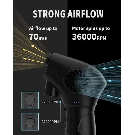 Souffleur de poussiere puissant avec nouvelle buse : le moteur de 36 000 tr/min fournit un flux d’air ultra puissant (pres de 70 m/s) pour un nettoyage en profondeur de la poussiere microscopique. Deux modes de debit d’air (36000/27000 tr/min) avec un nouveau jeu de buses pour s’adapter a differents appareils de nettoyage allant de l’ordinateur, de l’objectif de l’appareil photo, de la PS5, de l’ordinateur portable, des climatiseurs, du canape, des cartes de circuits imprimes aux instruments electroniques, des appareils medicaux.