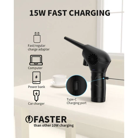 Charge rapide 15 W amelioree : le depoussiereur a air rechargeable concu avec un port de charge 15 W TYPE-C ameliore rend la charge plus rapide que l’autre port 10 W. Vous pouvez utiliser le cordon TYPE-C de votre telephone ou tablette avec un adaptateur de charge rapide (non inclus) pour charger.