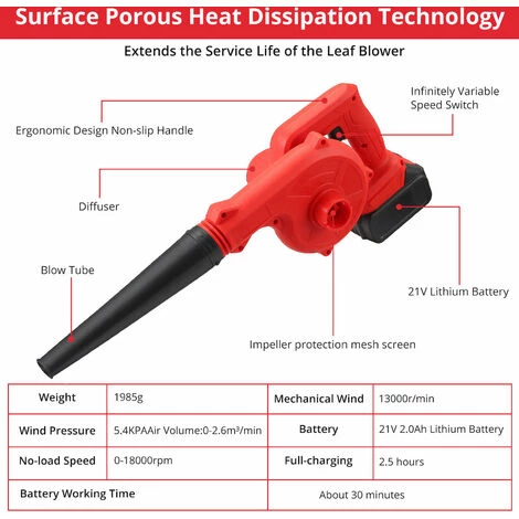 - 【 Vitesse maximale de 18 000 tr/min et capacité de la batterie de 2,0 Ah 】 Le moteur à vitesse variable du souffleur de feuilles sans fil offre une efficacité et un contrôle supérieurs, avec jusqu’à 18 000 tr/min au ralenti. La vitesse du ventilateur change lorsque la force de pression change. Le souffleur de feuilles est équipé d’une batterie de grande capacité de 2,0 Ah, qui peut répondre aux besoins d’une longue durée de travail.